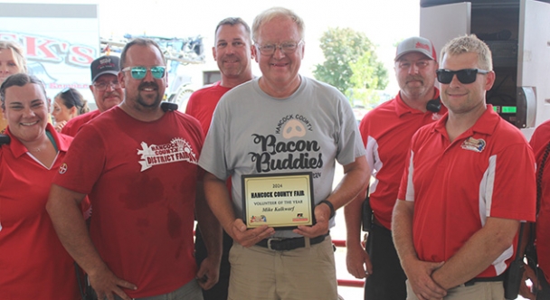Shortly before the ending auction and greased pig contest for the 2024 Hancock County District Fair on Sunday, July 28, the county fair committee presented their Volunteer of the Year award to Garner resident Mike Kalkwarf. The award is given out every year to commemorate the volunteer fairgrounds worker that the committee valued the most throughout the year.